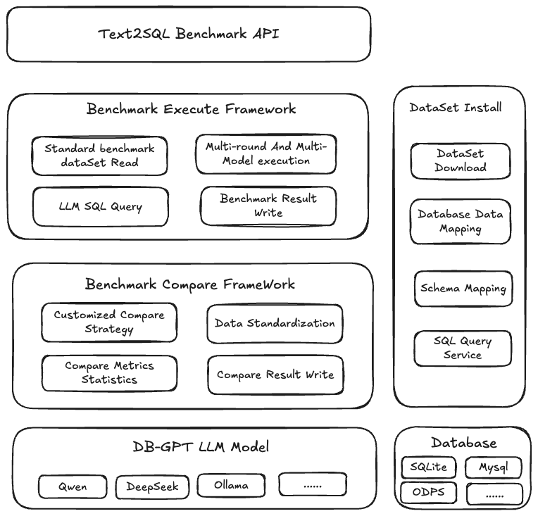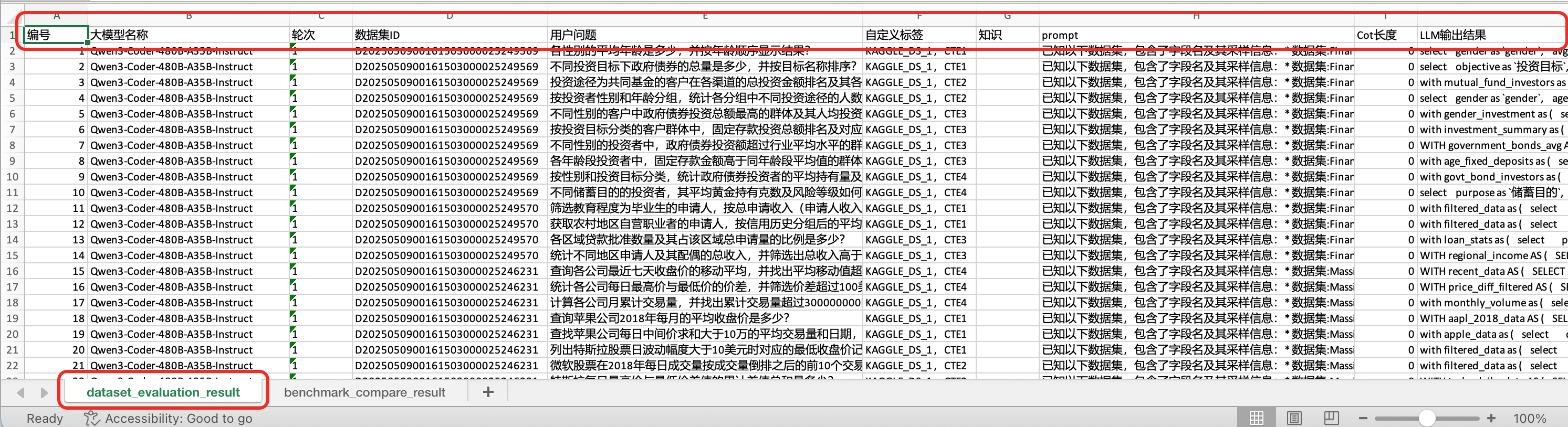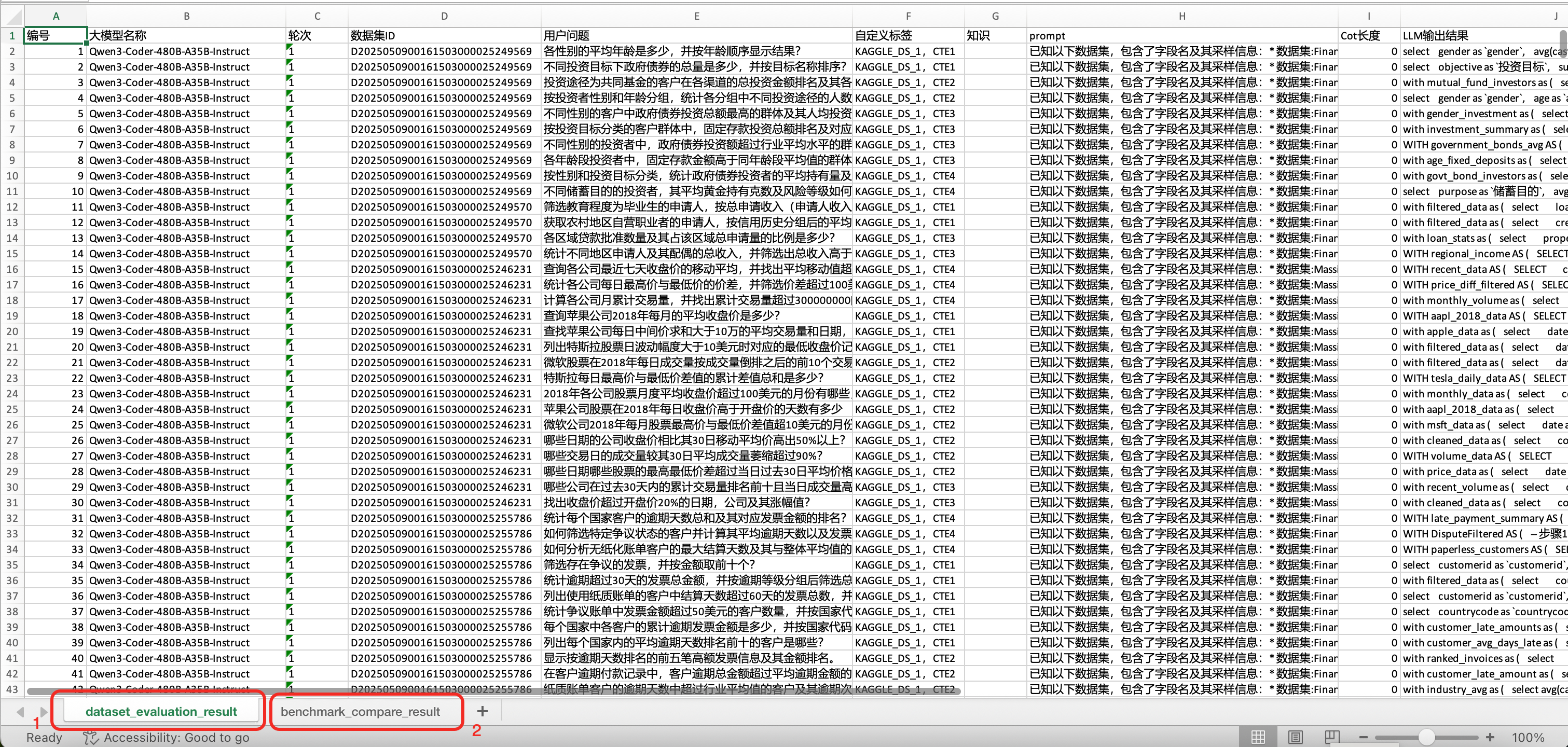 - Result comparison framework: compare results between the standard answers and LLM-generated SQL, and aggregate the evaluation results