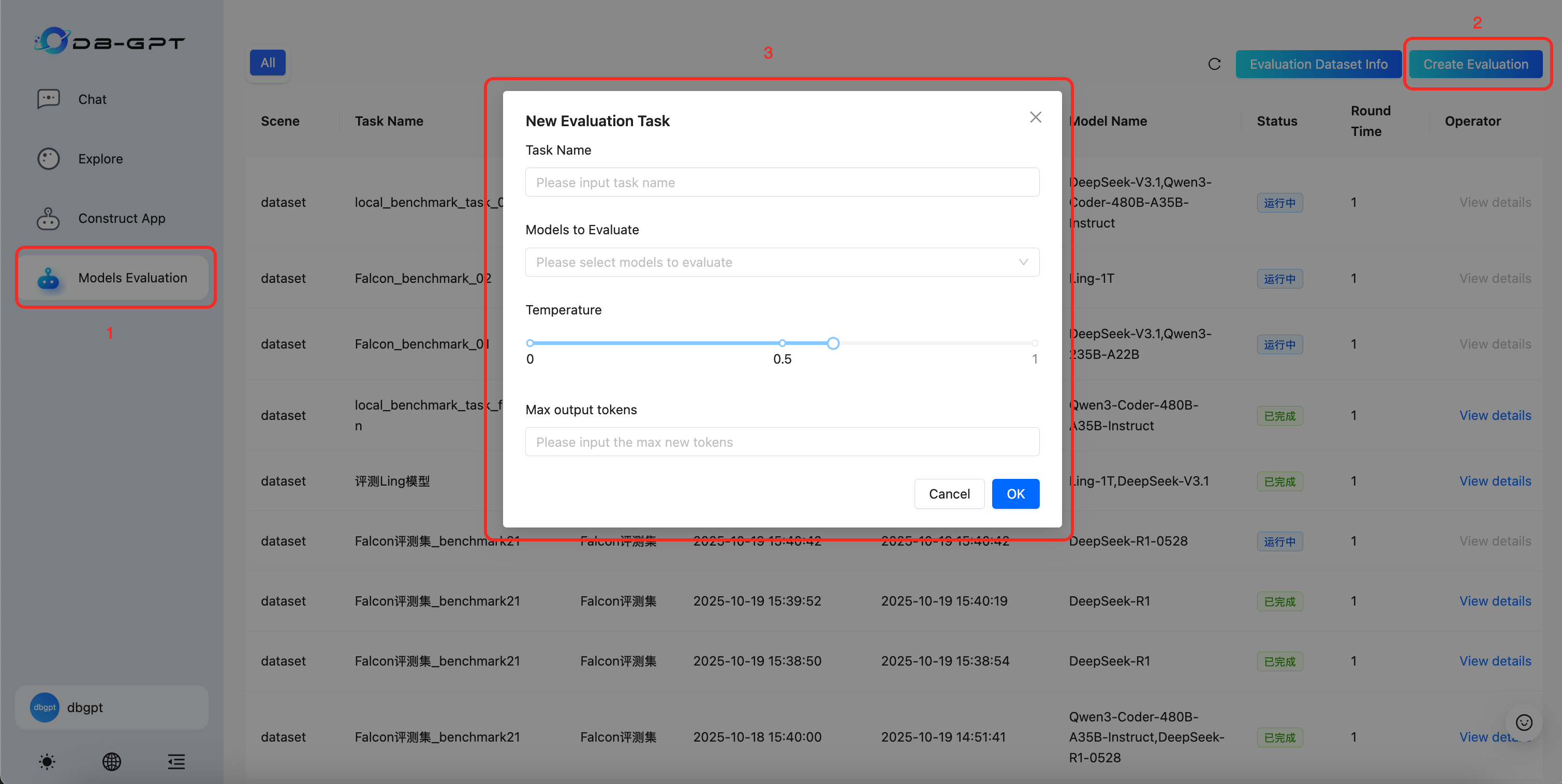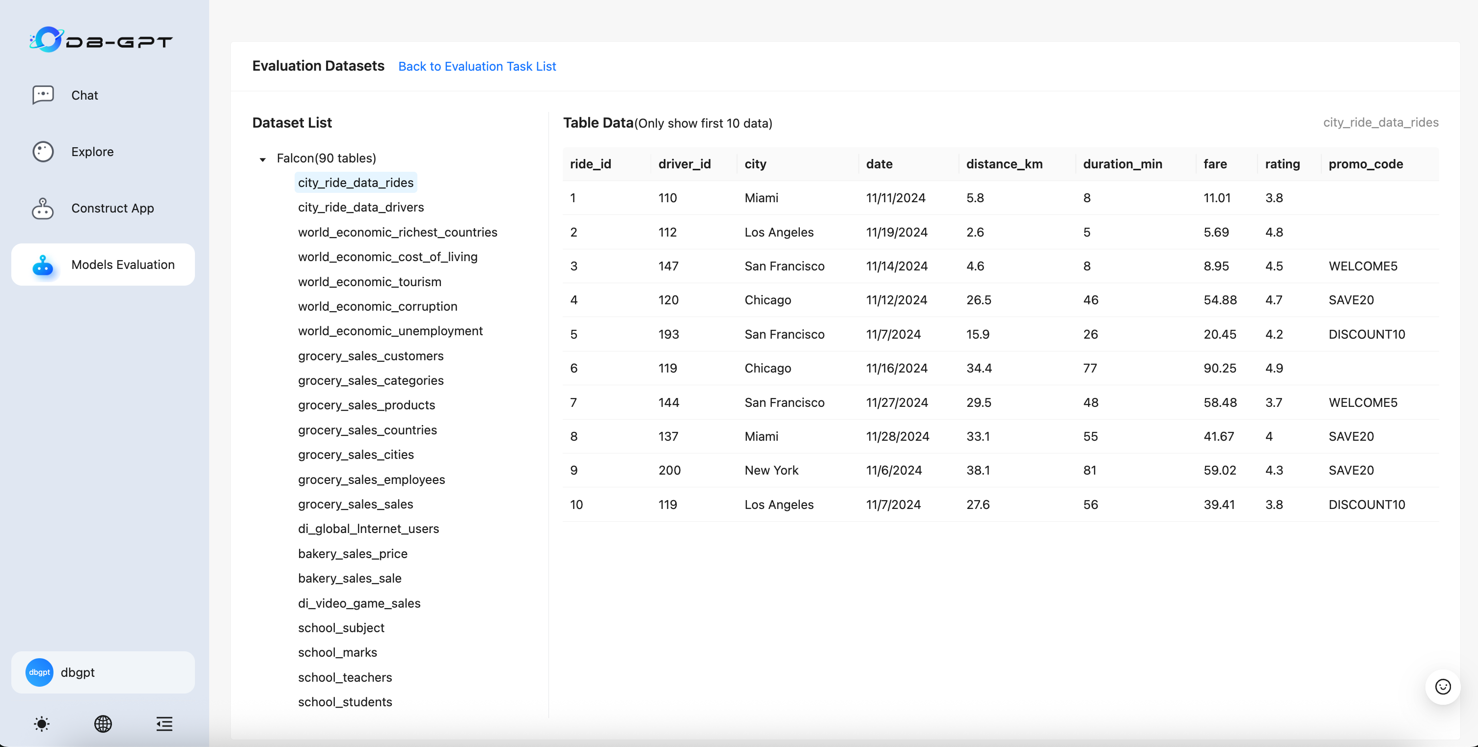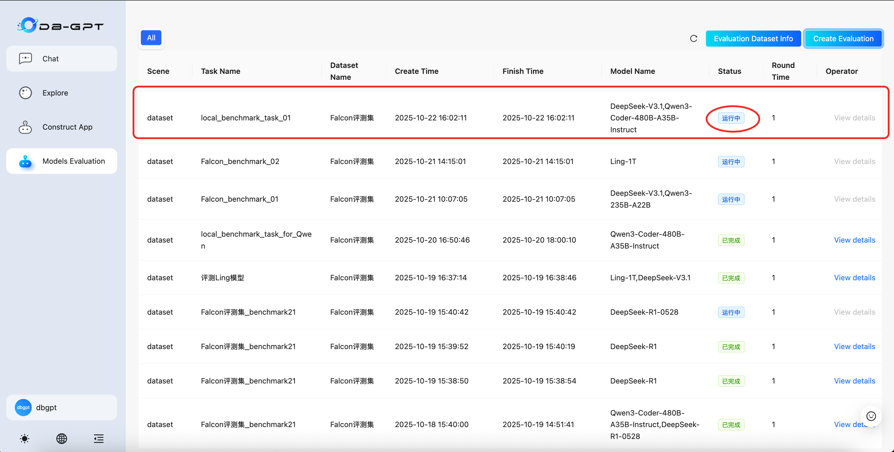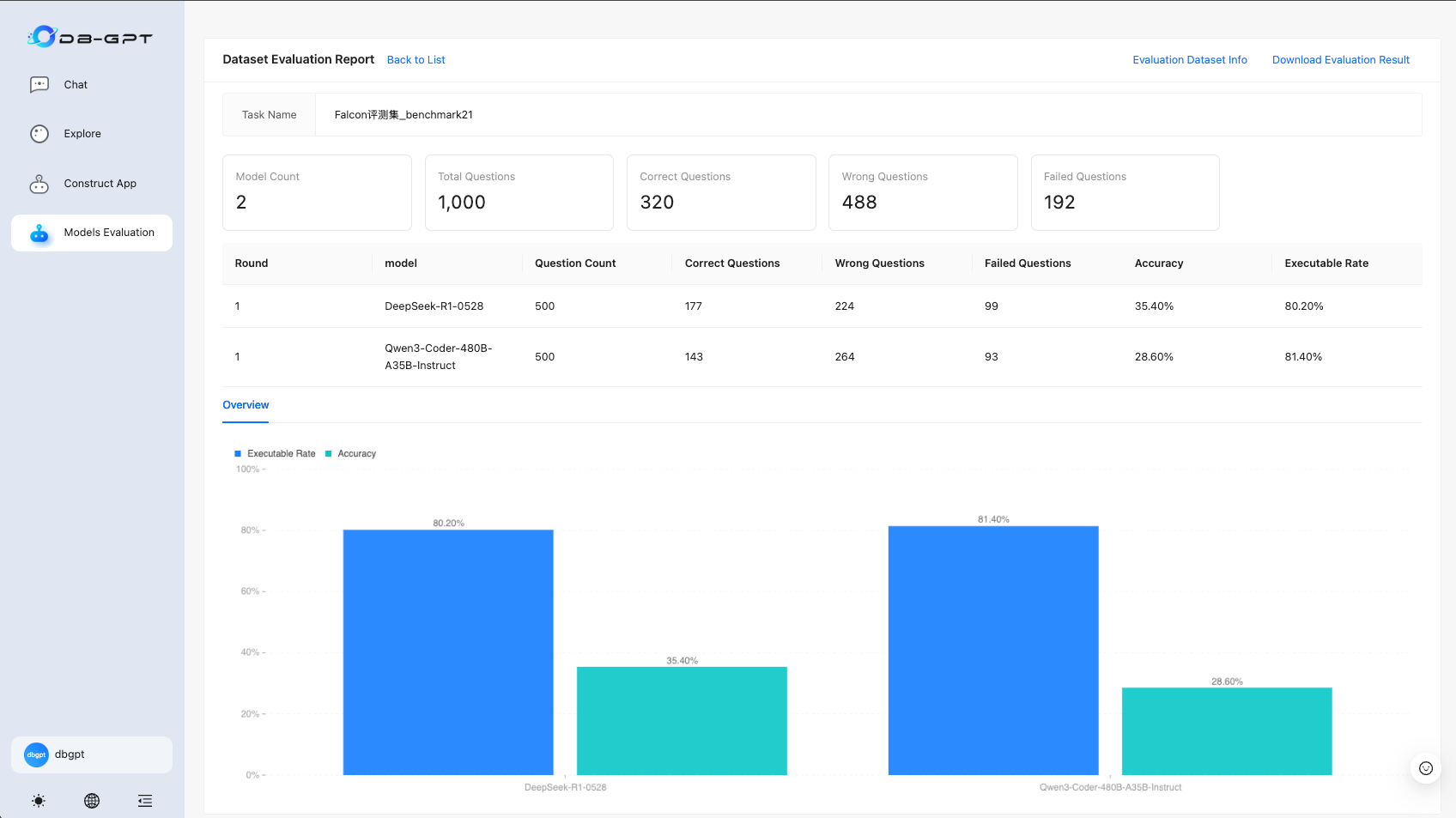 - DB-GPT supports LLM evaluation based on the Falcon benchmark dataset