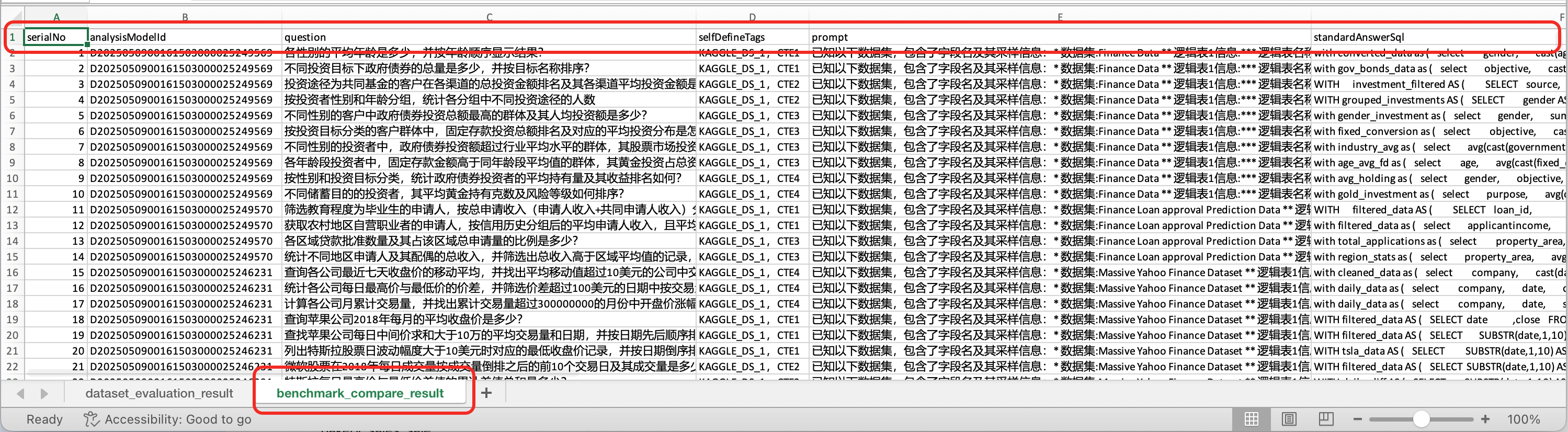 | compareResult | Comparison result between the reference answer and the LLM output | RIGHT: correct; WRONG: incorrect; FAILED: failed (usually the SQL has issues) |