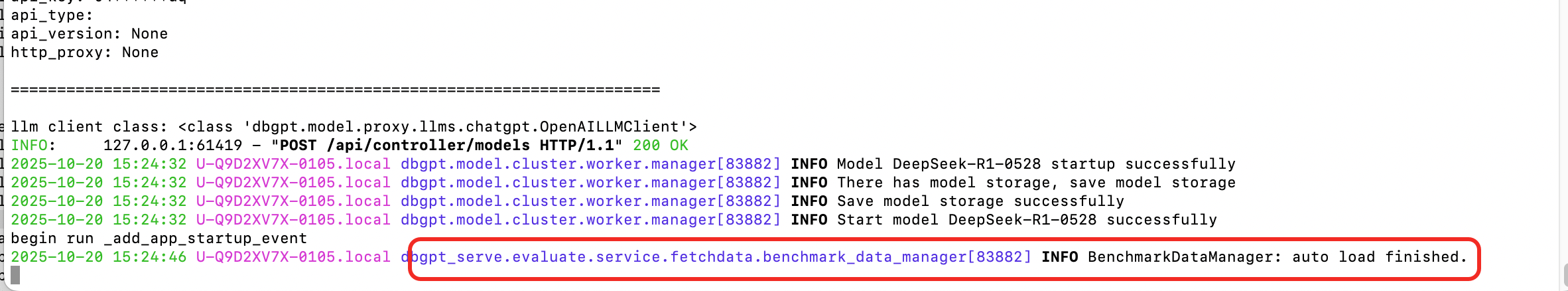 Step2: Start the DB-GPT service, and wait for the benchmark dataset to load automatically. When you see the log line, the dataset has finished loading (about 1~5 minute).