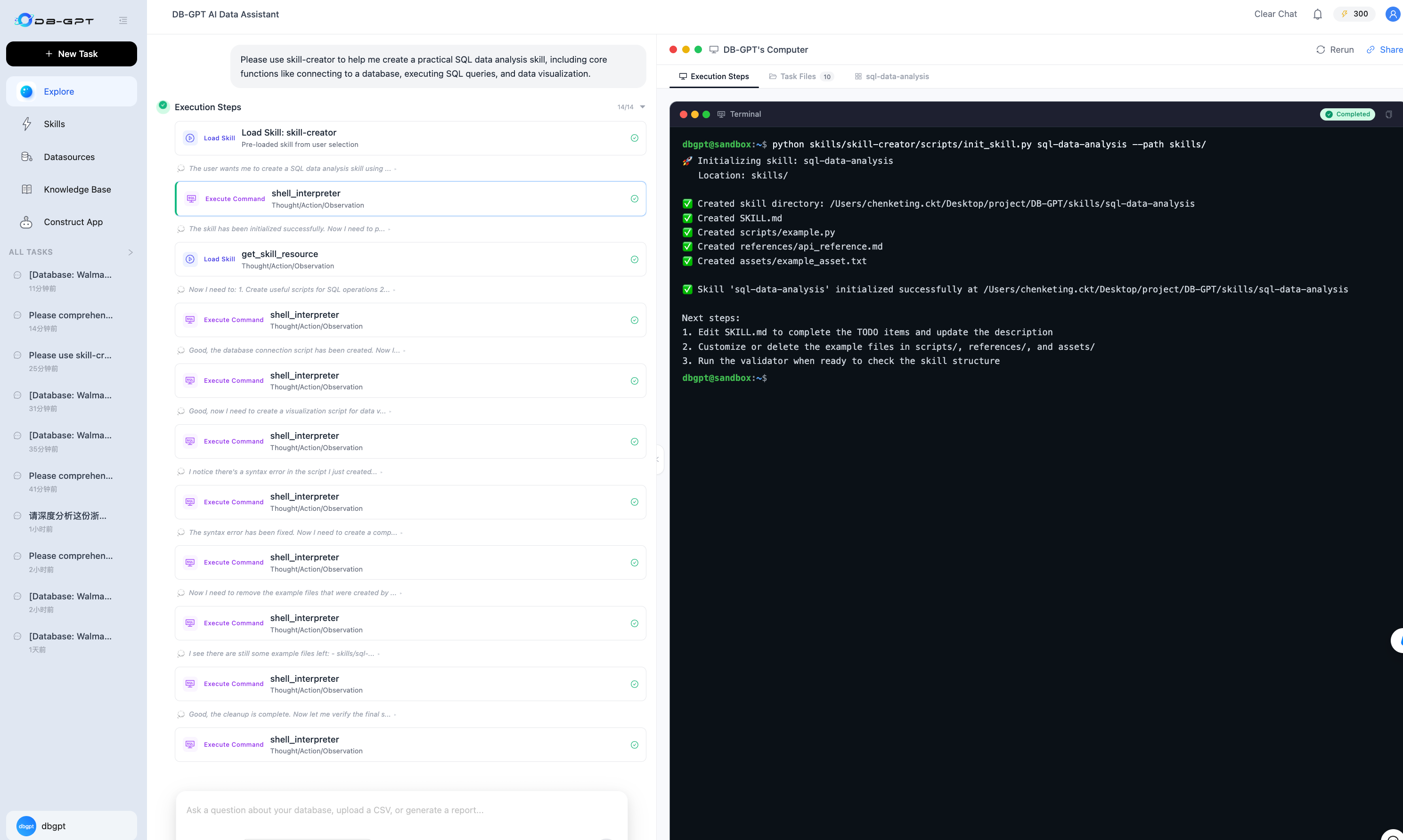 - Autonomous Reasoning & Exploration: For complex problems, the AI Data Assistant automatically analyzes database schemas or data files and plans multi-step execution strategies.